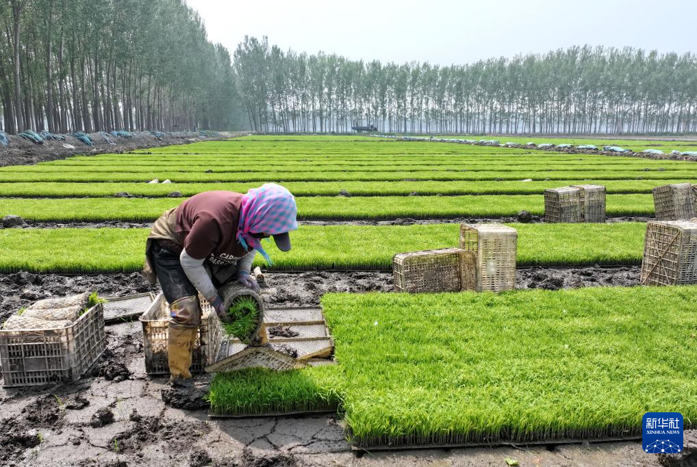5月17日,河北省唐山市曹妃甸区第八农场的农民在水稻秧苗棚内起秧。
