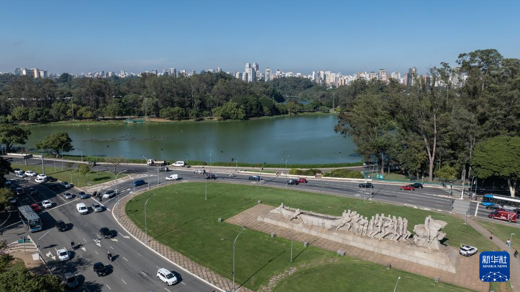 这是5月15日在巴西圣保罗拍摄的伊比拉布埃拉公园和旗手纪念碑(无人机照片)。