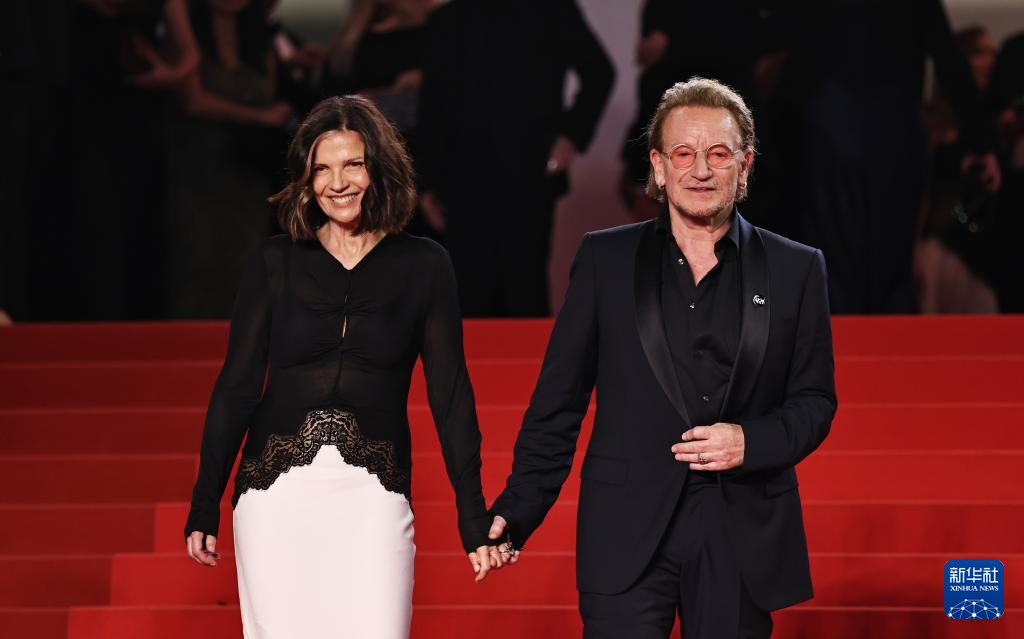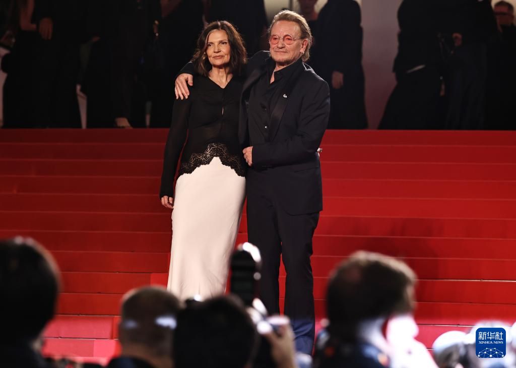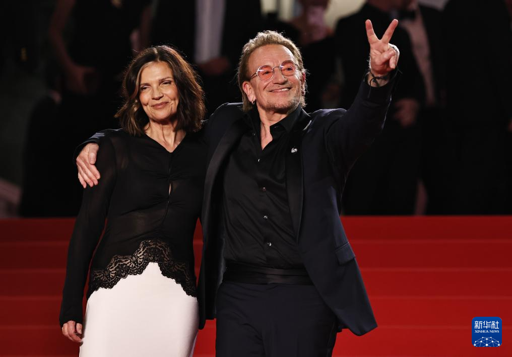 5月16日,在法国戛纳举行的第78届戛纳国际电影节上,爱尔兰摇滚乐队U2主唱波诺(右)和妻子在影片《波诺:关于投降的故事》首映后合影。