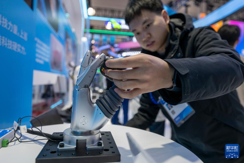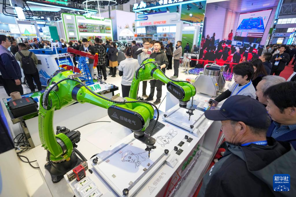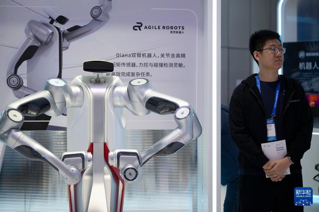 5月17日,在第三十四届哈洽会大庆展区,参会者在了解一款智能机械臂的运行情况。
