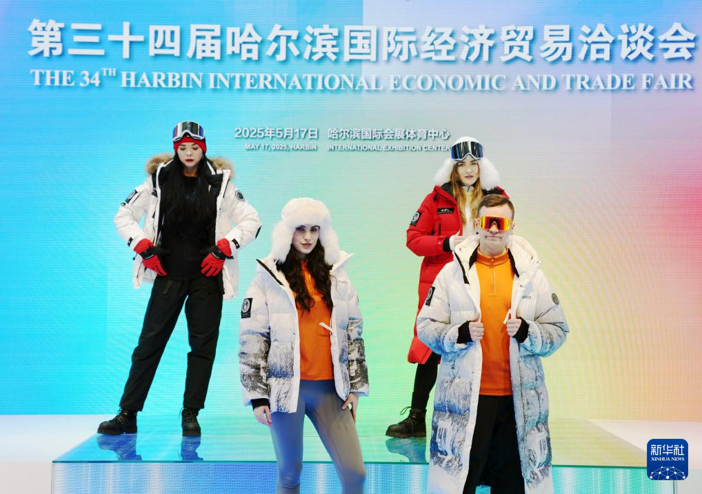5月17日,模特身着中国生产的波司登羽绒服与防寒用品在第三十四届哈洽会主会场进行走秀展示活动。