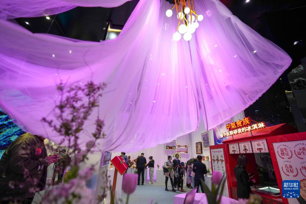 5月17日,在第三十四届哈洽会展会现场,参会者在参观文创产品。