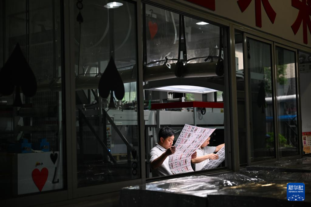 5月16日,在位于启东经济开发区的姚记扑克产业园生产车间,工人检查产品质量。