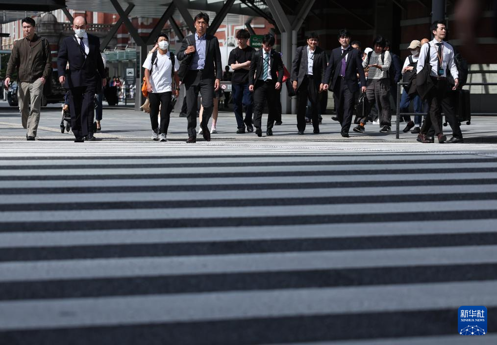 5月15日,在日本东京,行人通过东京站附近的一处人行横道。