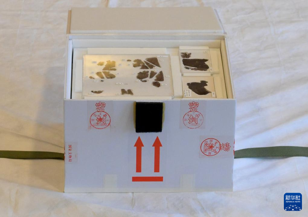 5月18日,在北京首都机场航站楼工作间内,一个保护箱被打开向现场媒体展示部分帛书碎片。