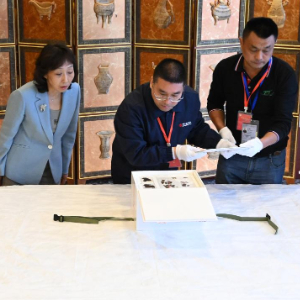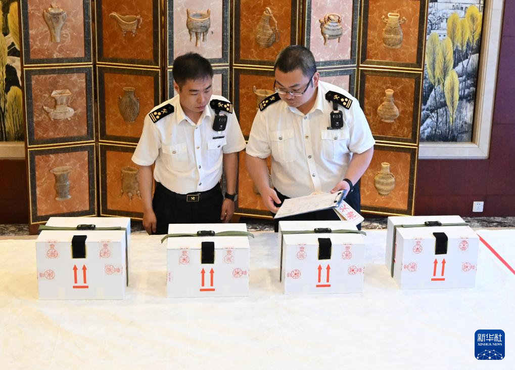 5月18日,在北京首都机场航站楼工作间内,由工作人员将文物帛书从外包装箱中取出交由国家文物局方面进行现场查验。