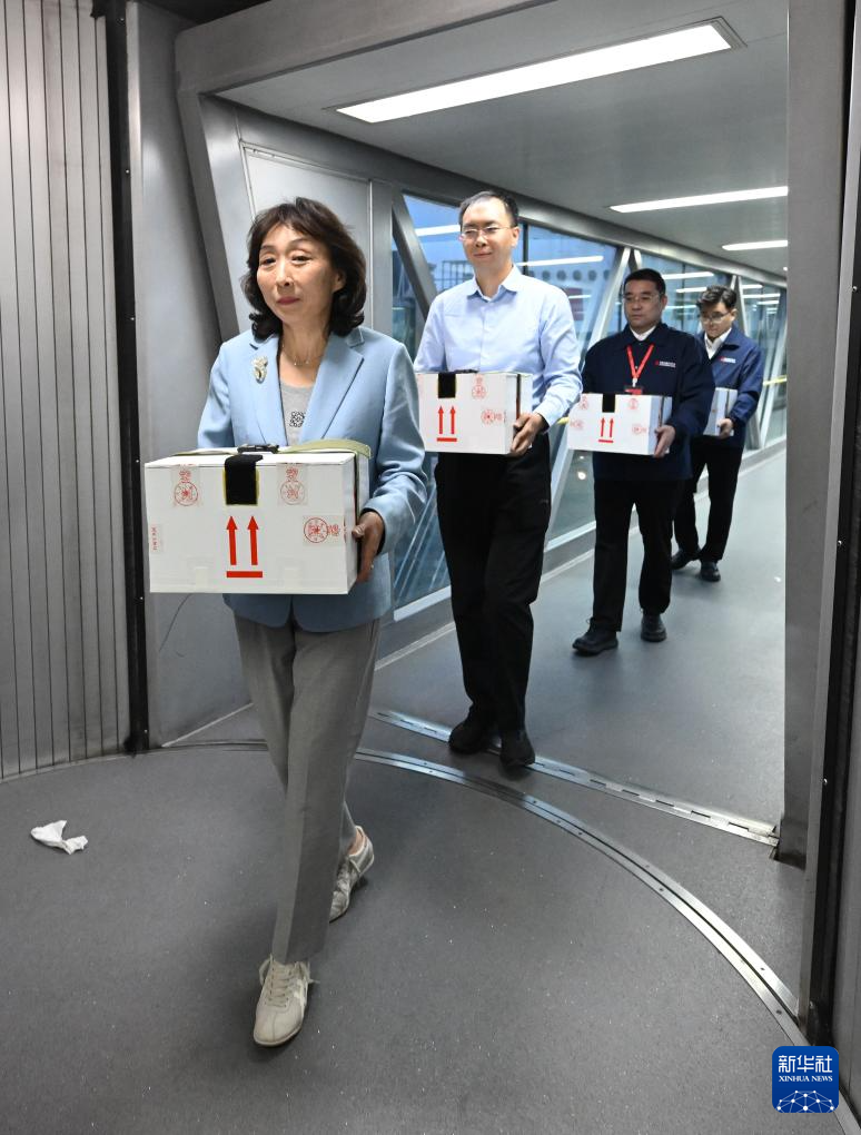 5月18日,护送文物归国的工作人员手捧装载着子弹库帛书的保护箱走出客机。