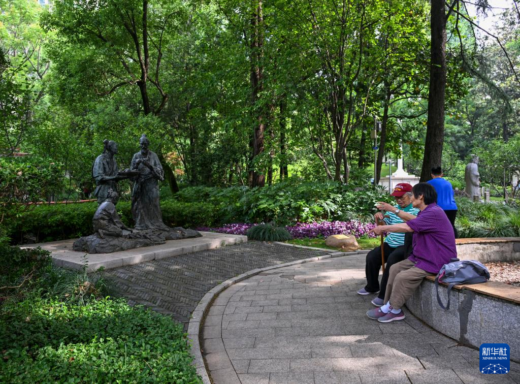 市民在光启公园休息(5月17日摄)。左侧为反映徐光启研究农事的雕塑。