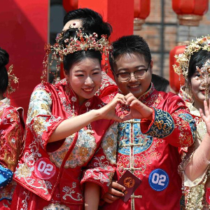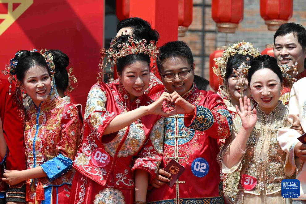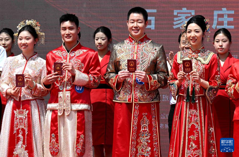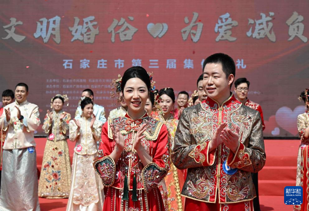 当日,河北省石家庄市第三届“良缘‘石’缔·佳偶新成”主题集体婚礼仪式在正太广场举行。50对新人在亲朋好友和现场观众的见证下喜结良缘。
