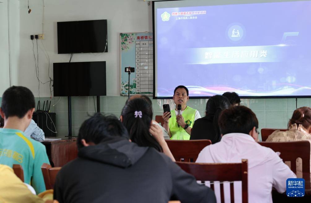 5月13日,柯水昌在上海奉贤区南桥镇一个阳光之家教室内为学员讲解手机使用中遇到的问题。