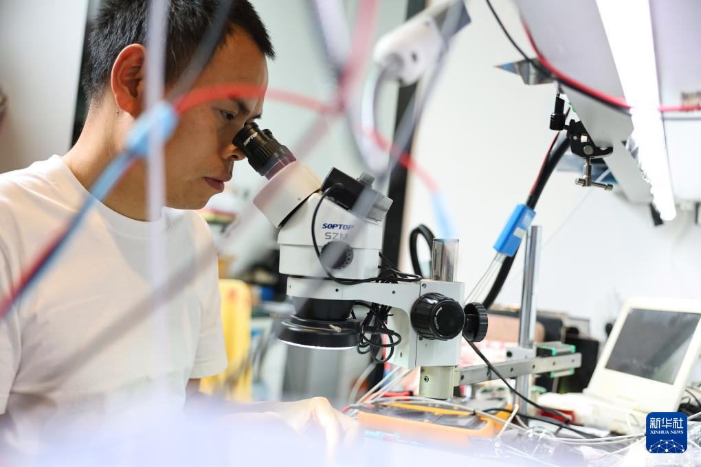 5月17日,柯水昌(左)在维修工作间内维修手机。