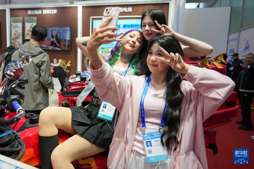 5月18日,在哈洽会佳木斯同江展区,观众与越野摩托车展示模特合影。