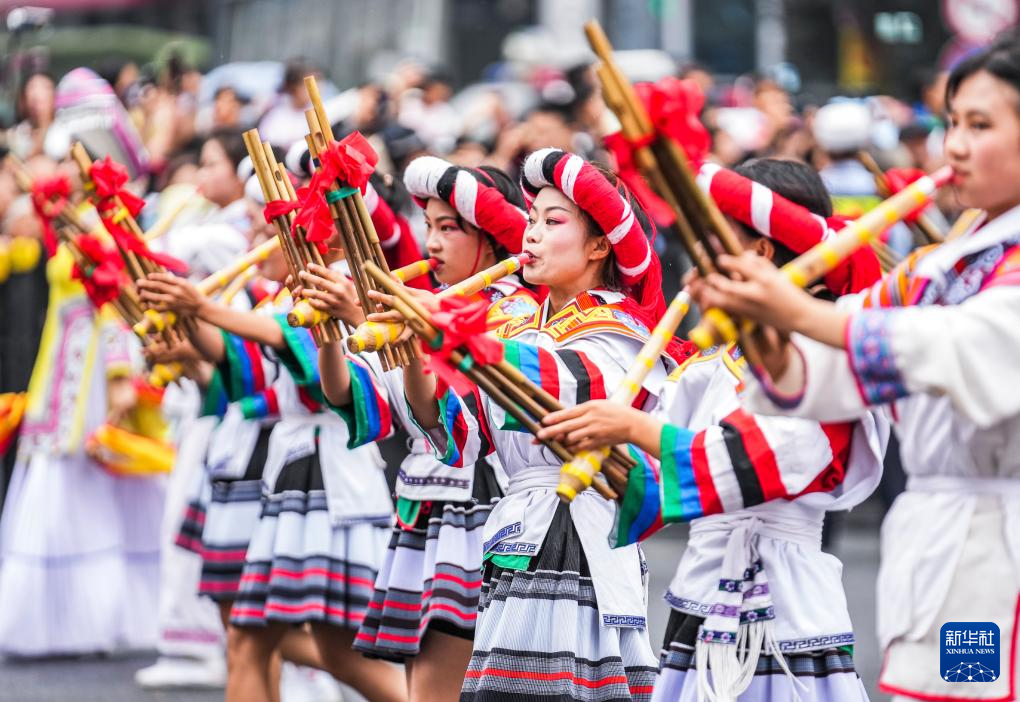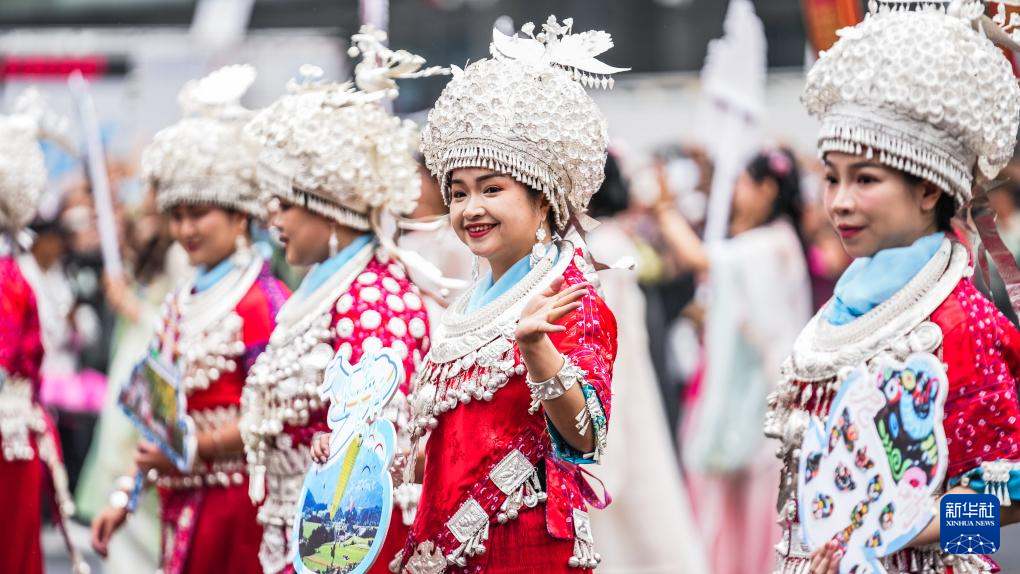 当日,贵州民族团结大巡游活动在贵州省贵阳市举行。来自贵州省9个市(州)的3600余人组成26个特色方阵,集中展示贵州的民族文化和时代风尚。
