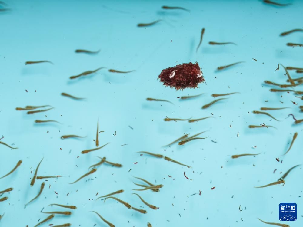 5月18日,川陕哲罗鲑子二代鱼苗正在摄食。