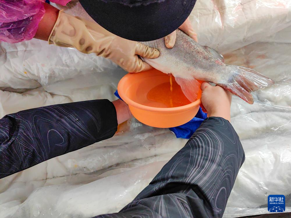 科研人员在采集川陕哲罗鲑子一代雌鱼的鱼卵(3月2日摄)。