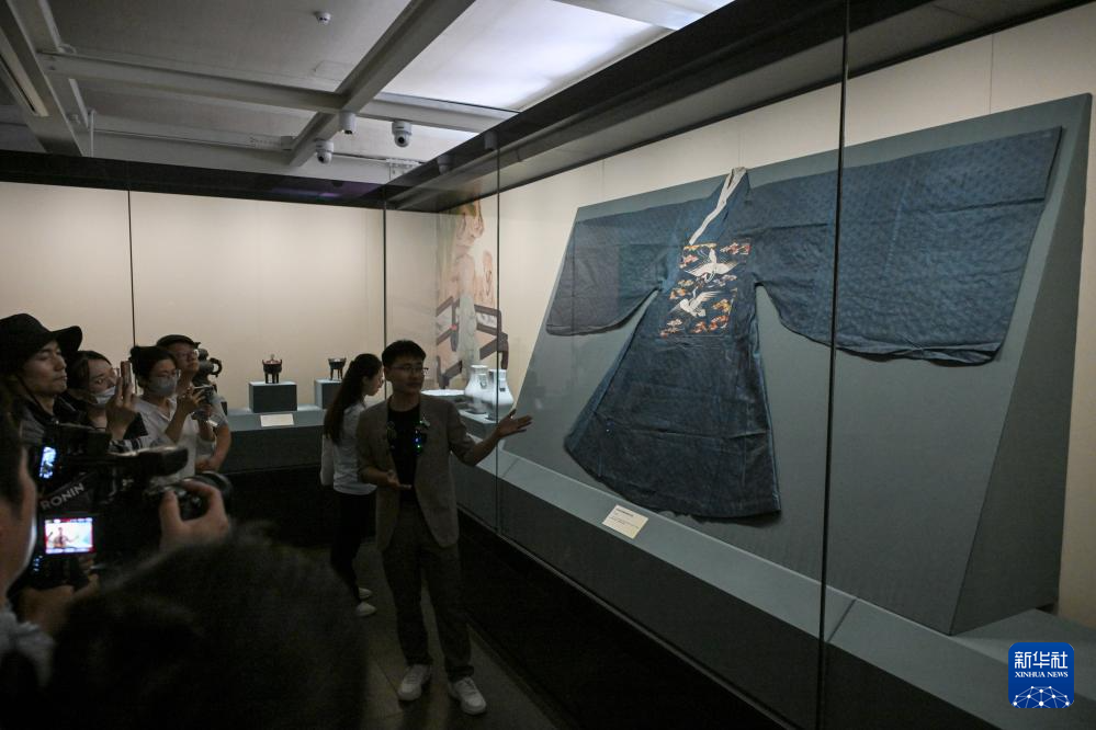这是展出的明代蓝色暗花纱缀绣仙鹤方补袍(5月19日摄)。