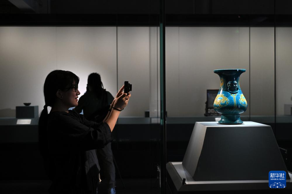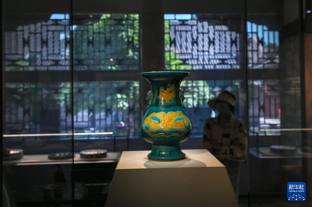 5月19日,记者拍摄展出的清代珐华三彩刻划兽面纹铺首耳琵琶尊。