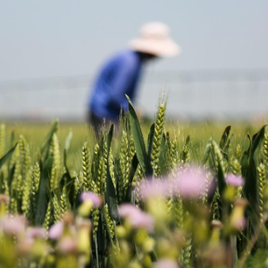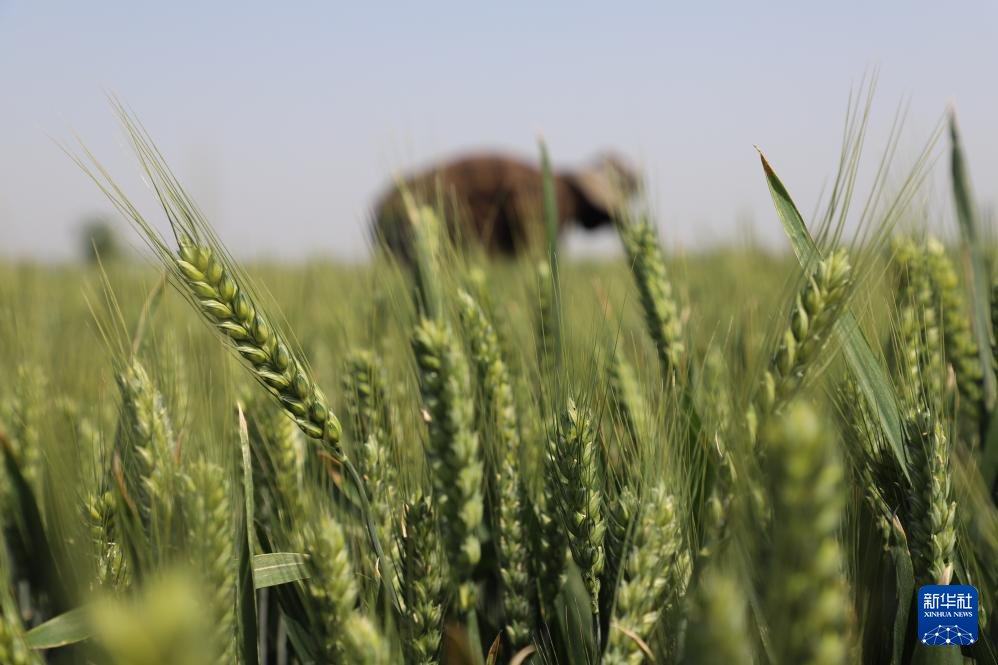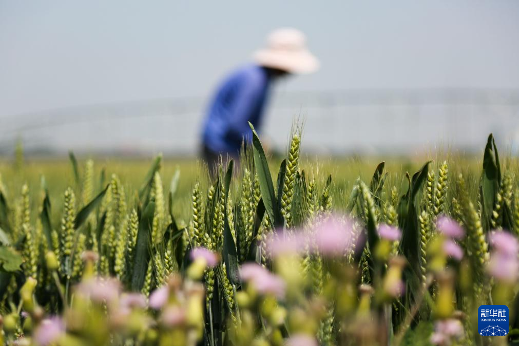 5月20日,在山东省滨州市沾化区冯家镇范庄村,农户在麦田里查看小麦长势。