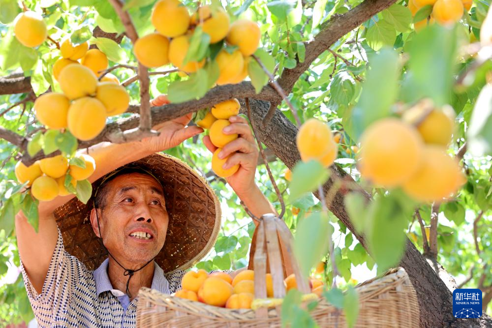 5月20日,山东省枣庄市市中区齐村镇凤凰岭村农民在果园采摘鲜杏。