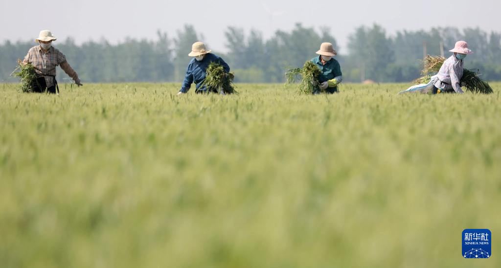 5月20日,农民在山东省东营市广饶县李鹊镇苏家村的麦田里拔草。