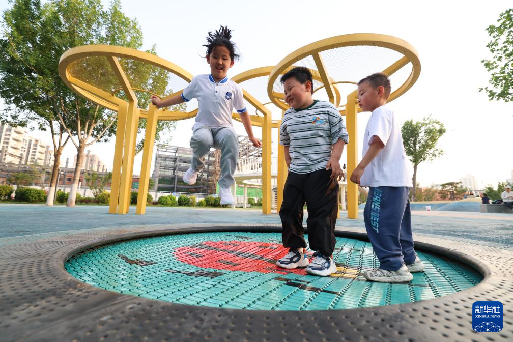 5月19日,小朋友们在石家庄拾光智慧体育公园玩耍。