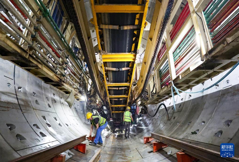 5月19日,在河北省石家庄市地铁4号线体育公园站,工人检查盾构设备。