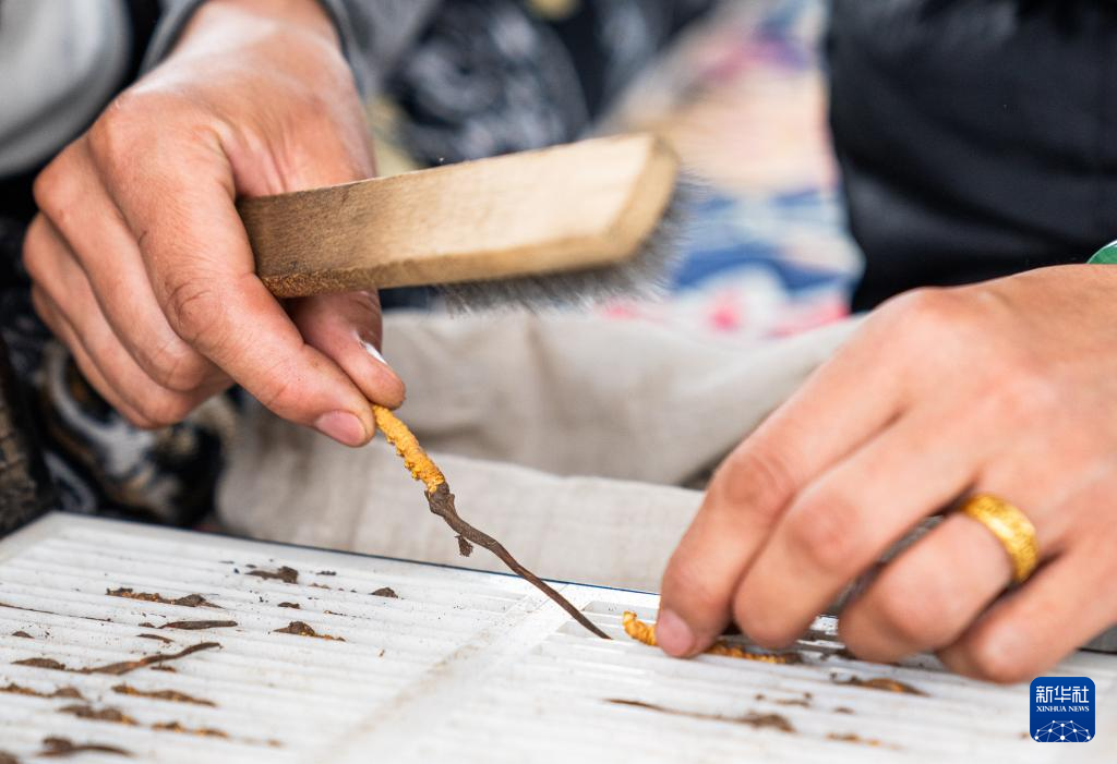 在那曲市索县西昌乡,牧民白嘎在收纳清理好的虫草(5月18日摄)。
