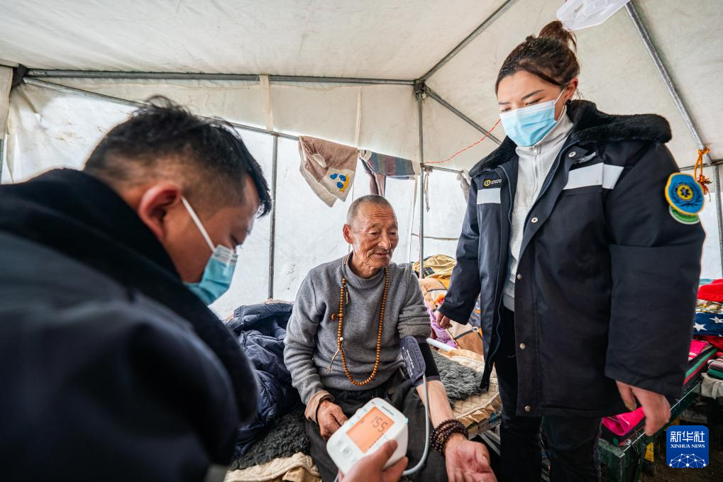 在那曲市索县西昌乡,卫生院医务人员为虫草采集点的牧民测量血压(5月18日摄)。