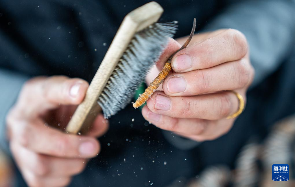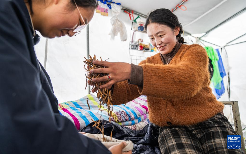 在那曲市索县西昌乡,牧民将清理好的虫草装袋收纳(5月18日摄)。