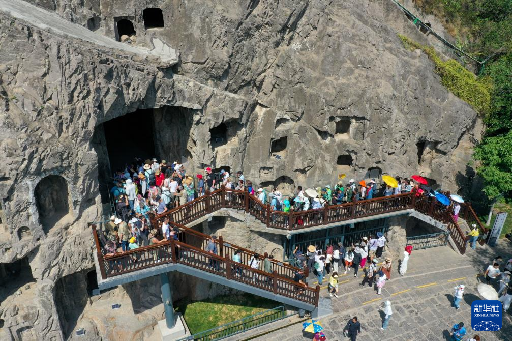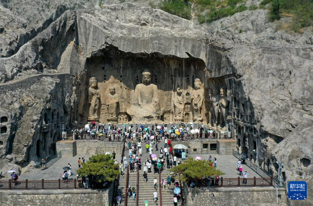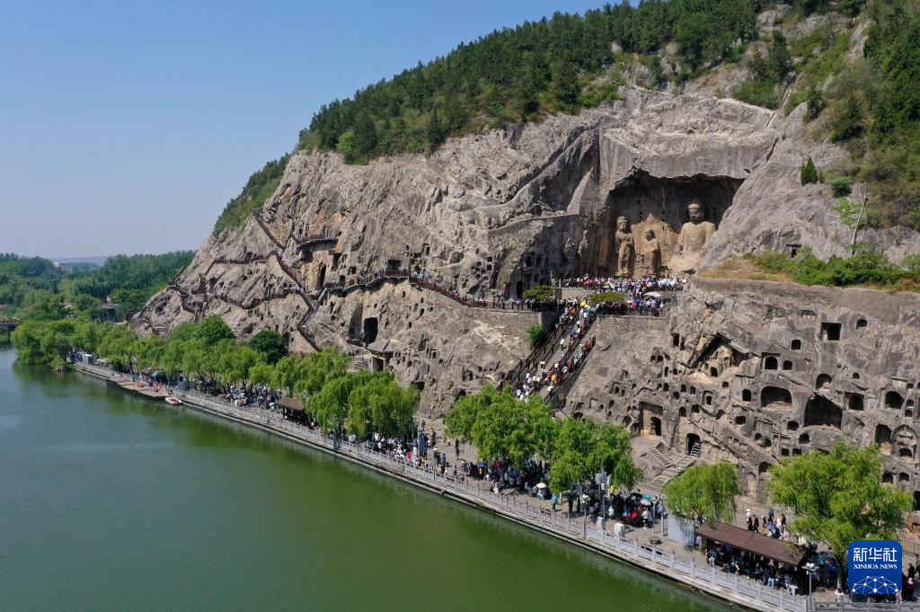 5月20日,游客在龙门石窟游玩(无人机照片)。