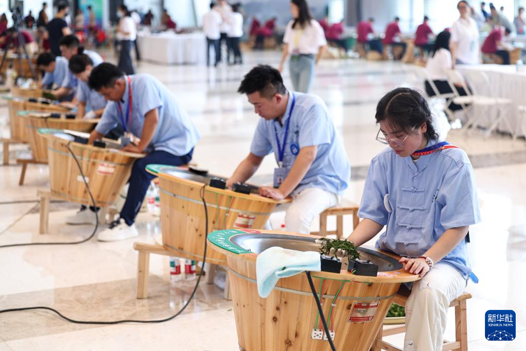 5月21日,参加2025年浙江省龙井茶炒制技能大赛的选手在炒制龙井茶。