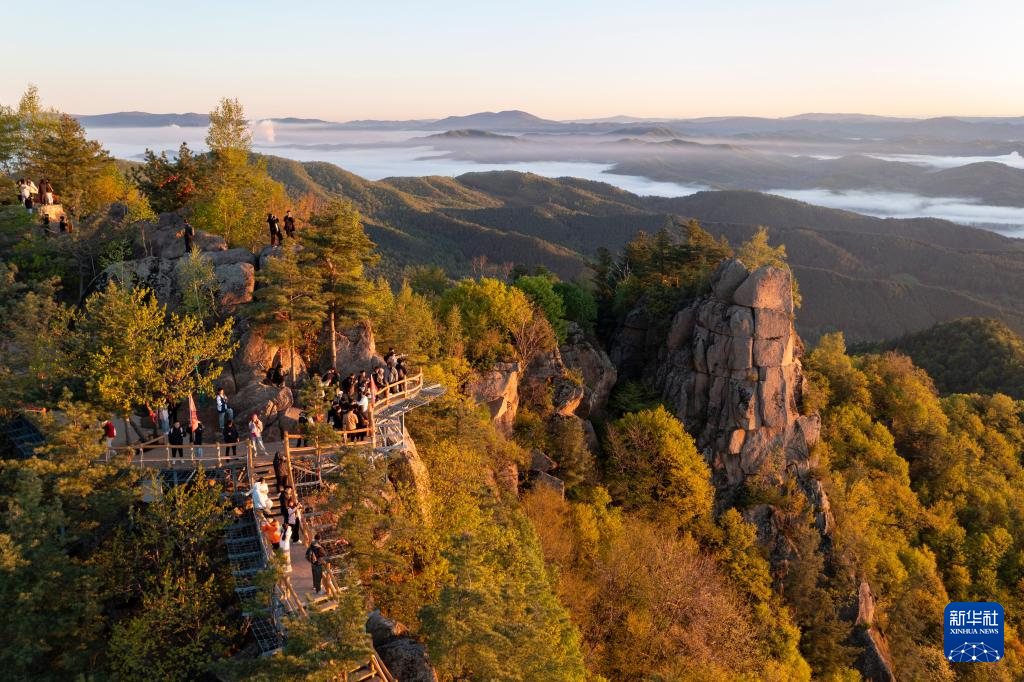 5月21日清晨,游客在伊春市金祖峰景区山顶观赏日出云海景观(无人机照片)。