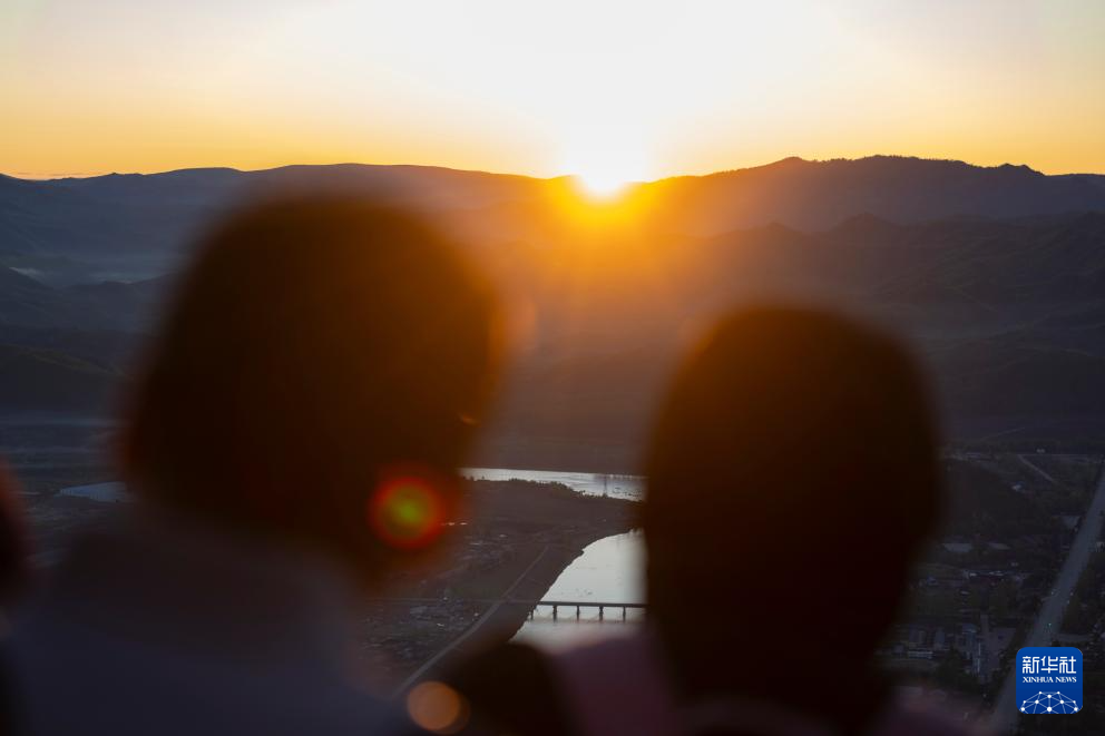 5月21日,游客在伊春市金祖峰景区山顶欣赏日出。