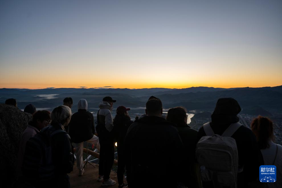 5月21日凌晨,游客在伊春市金祖峰景区山顶等候日出。