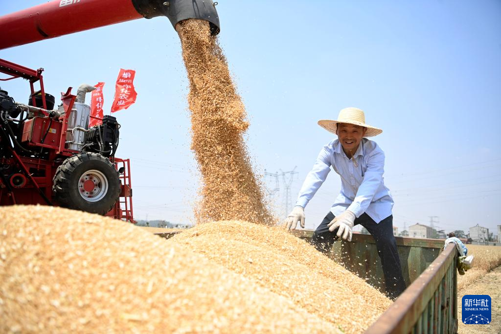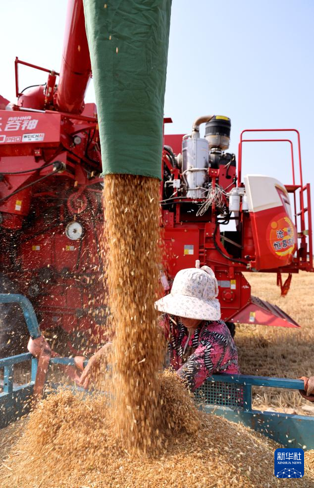 5月21日,安徽省亳州市蒙城县乐土镇建明村农民从收割机上卸下刚收获的麦粒。