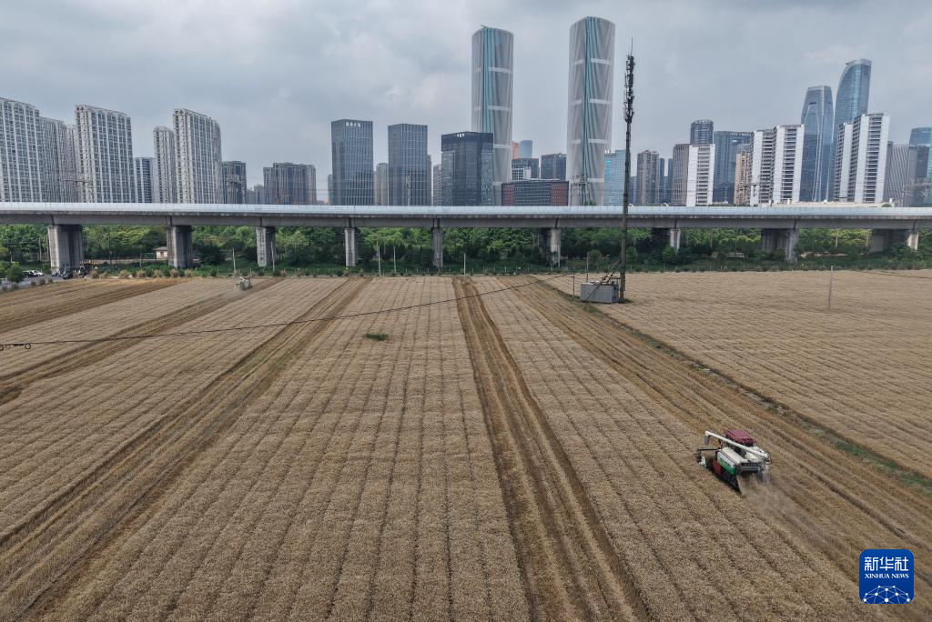 5月21日,在湖北省襄阳市襄州区古驿镇原种场一队,小麦“三优两增一稳”示范片在进行机收作业。