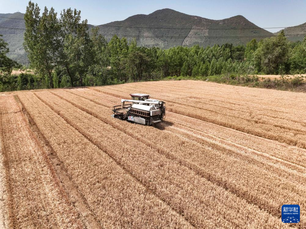 5月21日,河南省济源市克井镇农民使用农机收割小麦(无人机照片)。