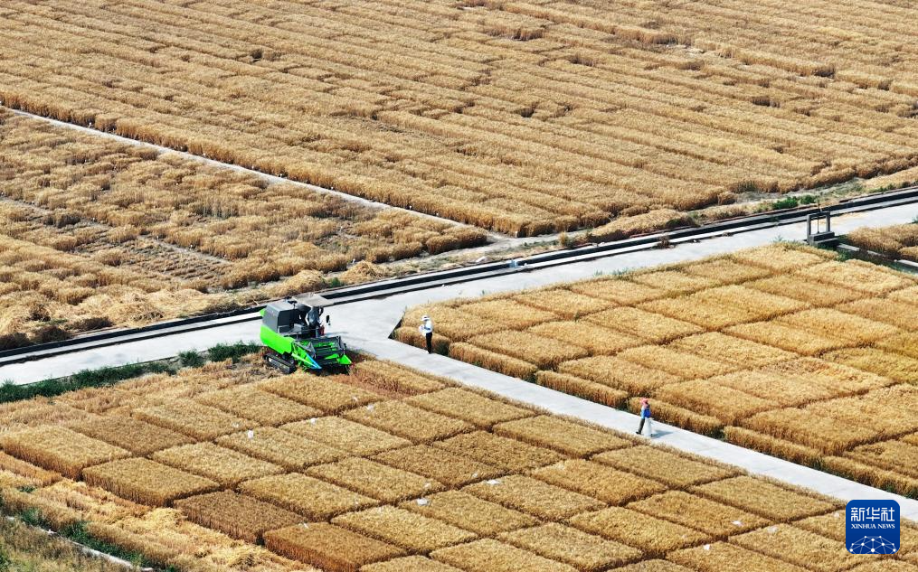 5月22日,收割机在江苏里下河地区农科所(扬州市农科院)收割小麦(无人机照片)。