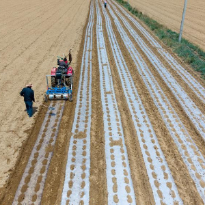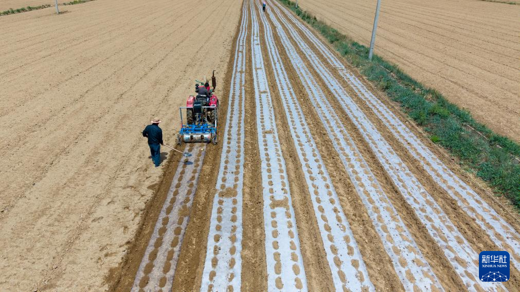 5月22日,在环县曲子镇五里桥村,村民对农田实施机械覆膜保墒作业。