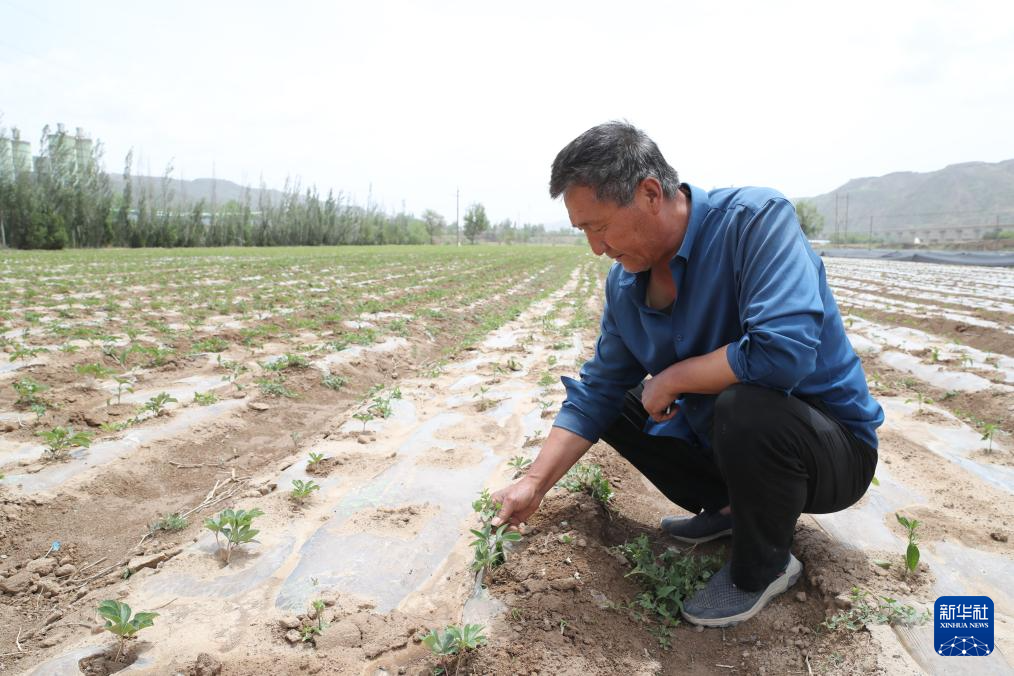 5月22日,在环县曲子镇五里桥村,村民察看农作物生长情况。
