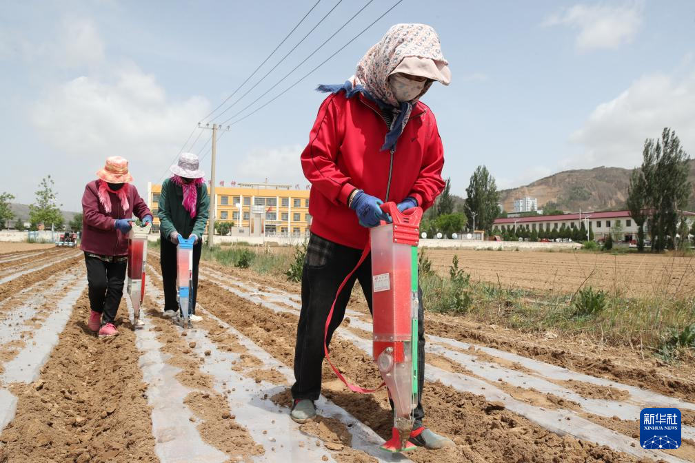 5月22日,在环县曲子镇五里桥村,村民手持点播器点播大豆。