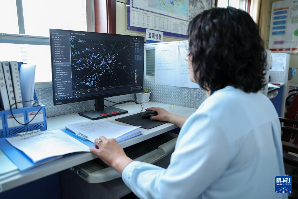 5月22日,在环县气象局,高级工程师李巧霞通过查看雷达回波科学研判天气演变情况。
