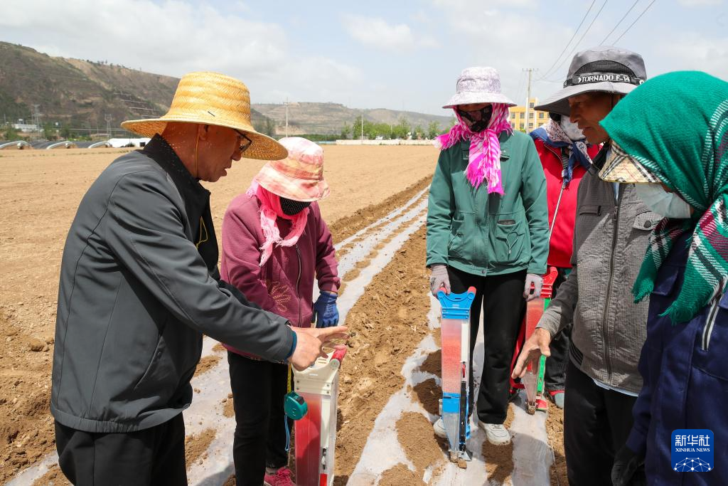 5月22日,在环县曲子镇五里桥村,环县农业农村局农技人员(左一)指导村民播种秋粮。