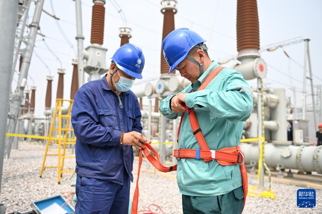 5月21日,冯正军(右)在位于保定市高阳县的国网王庄220千伏变电站内穿戴安全绳,准备进行电气试验。