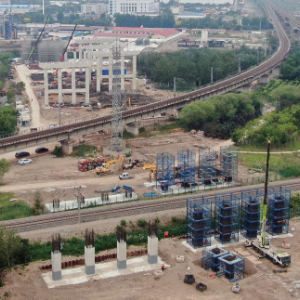 初夏时节,天津港集疏运专用货运通道工程第2标段项目施工现场一派繁忙,中铁十八局的建设者抢抓有利天气,加快施工进度。