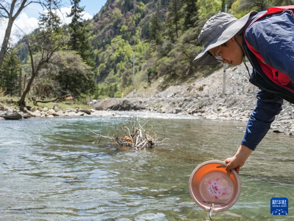 在四川省阿坝州松潘县岷江支流纳咪沟,喻燚将捕获的渔获物测量记录数据后放回原水域(5月20日摄)。