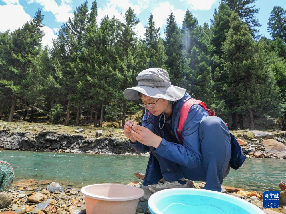 喻燚在四川省阿坝州松潘县岷江支流纳咪沟查看鉴定刚刚捕获的渔获物(5月20日摄)。