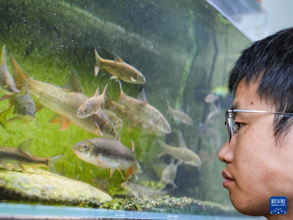 喻燚在四川省农业科学院水产研究所观察饲养的各种鱼类(5月6日摄)。