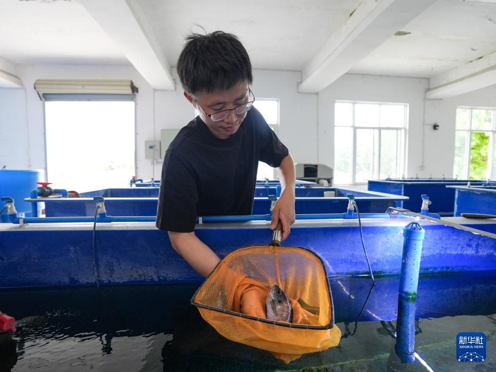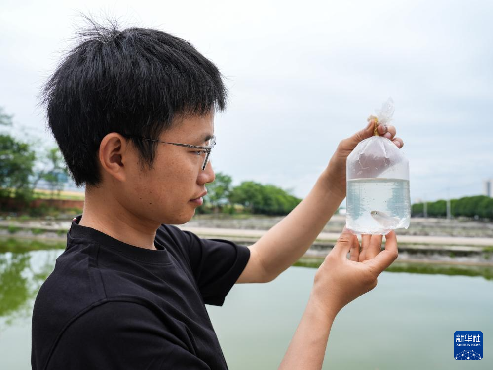 喻燚在四川省农业科学院水产研究所观察刚收到的屏东须鱲(5月6日摄)。