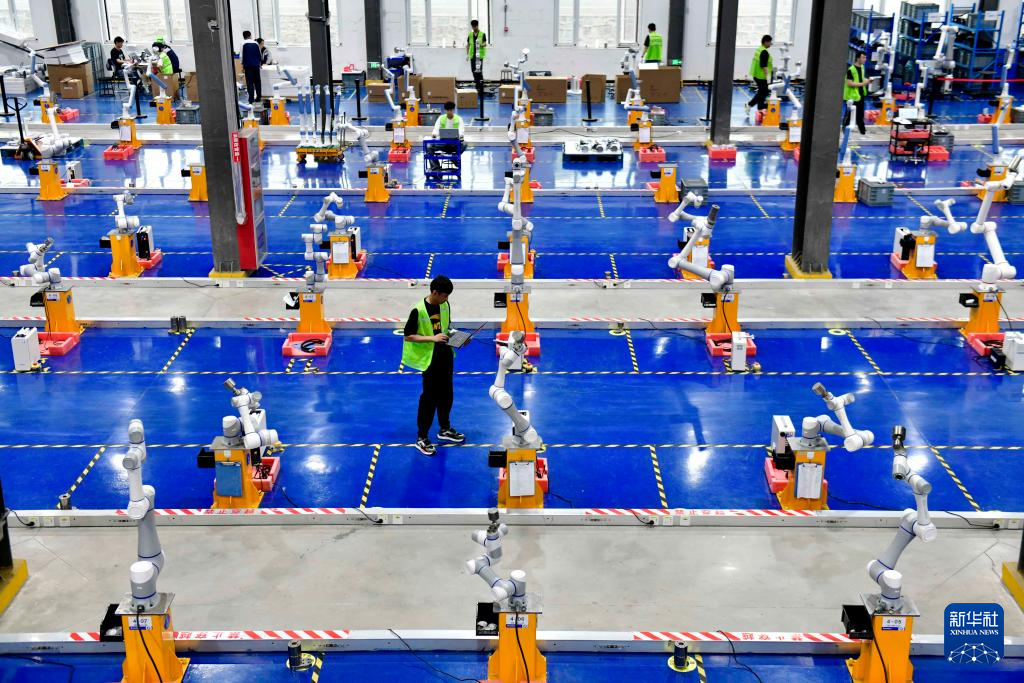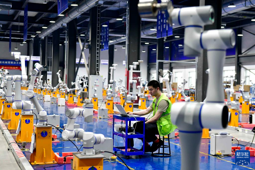 5月20日,日照市越疆智能科技有限公司工作人员在调试工业机器人。
